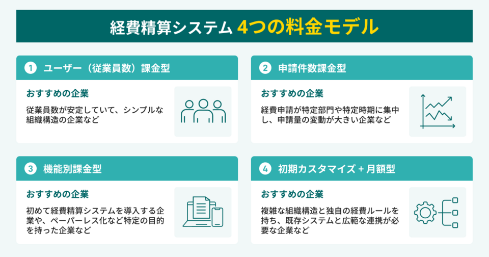 経費精算システムには大きく分けて4つの料金モデルがあり、それぞれでおすすめの企業が異なります。