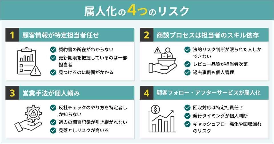 営業業務の属人化は、表面化しにくいものの企業の根幹を揺るがす深刻なリスクです。