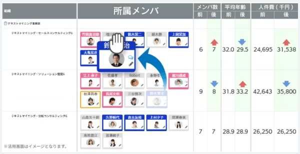 社員の顔と名前、人事異動の意思決定に必要になるキャリア(経験)やスキル、組織への滞留期間を一覧で見ながら、人材配置のシミュレーションをすることが可能です。社員のアイコンをドラッグ&ドロップで異動させる直感的な操作で、異動によるキャリアやスキルの偏りといった影響度をしることができ最適な人事異動を実現できます。