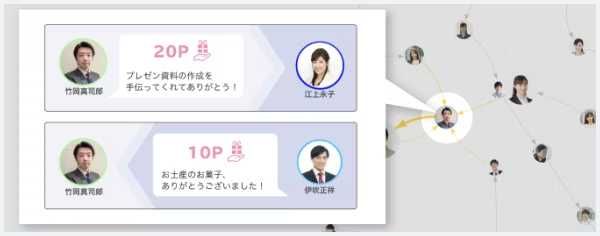 簡単な操作で、社員間で感謝のメッセージと共に感謝のポイントを付与でき、社内のコミュニケーションを活性化することができる。
