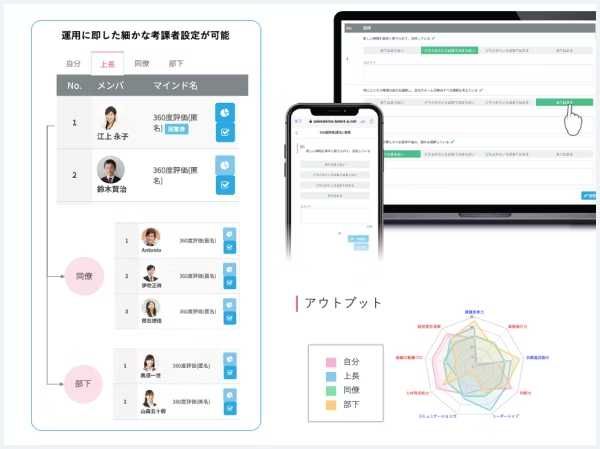 評価者は、本人/上司/同僚/部下とそれぞれの設定ができ、360度評価の評価項目も自社の運用に合わせて、自由に設定することができます。また、評価者を指定、および指定した条件(組織、役職)で評価者の候補をランダム抽出し、設定するなど運用に即した細かな設定を実現します。