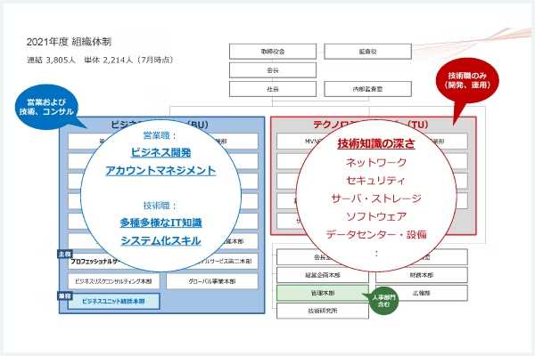 IIJは法人向けインテグレーション事業とサービス事業の2つを事業ポートフォリオに持ち、ビジネスユニット(営業、コンサル部門)とテクノロジーユニット(技術開発部門)の2軸で組織を構成している。