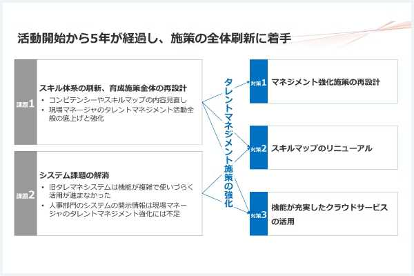 これらを理由に、マネジメント強化施策を再設計すること、スキルマップをリニューアルすること、機能が充実したクラウドサービスを活用すること、この3つの方針を採ることになりました。
