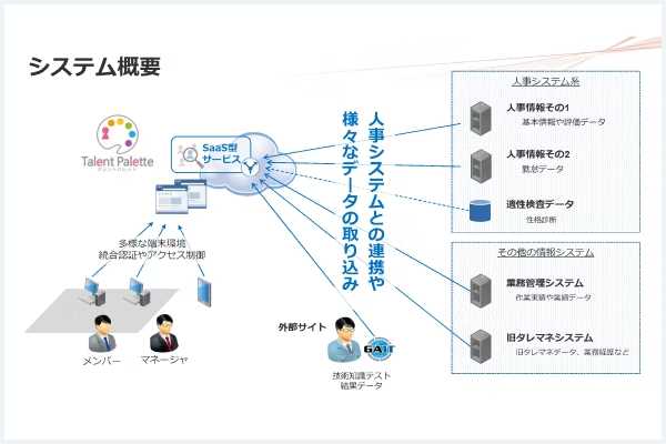既存の人事システムや保存されている一部の人事データをタレントパレットに連携。様々なデータを取り込み人材データのプラットフォームとして活用。
