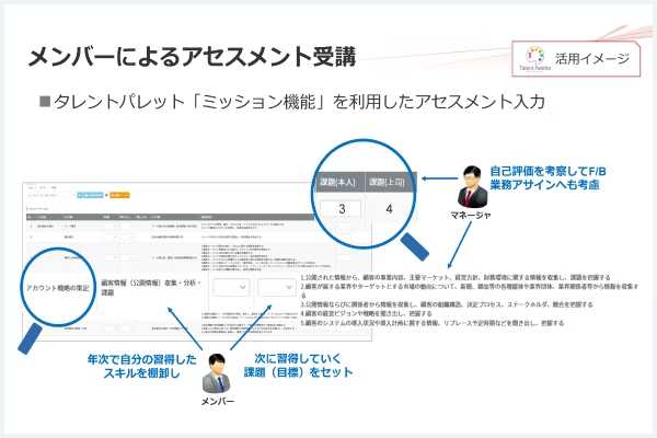 また、スキルマップの定義内容自体をタレントパレットに全て反映しています。たとえばメンバーがアセスメントを受講することで、「人に教えるぐらいのレベルで仕事ができるか」「もしくは全くできないか」など4~5段階の評価が下されるようになっています。さらに今年の課題を本人と上司がそれぞれ設定し、アセスメントとして集約する仕組みにしました。