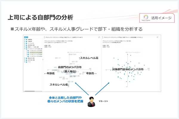 合わせて、上司は自部門のメンバーがスキルと年齢、スキルと人事グレードの分布図においてどこに位置しているか、会社全体と比較するとどうかを見ることも可能です。