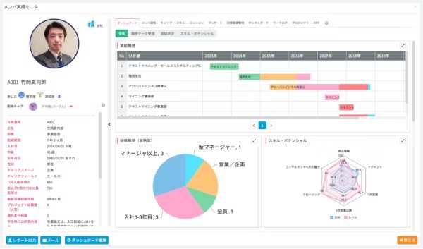 自社で保持している様々なデータを社員に紐付けて一元化、柔軟にグラフ化することができます。点のデータだけでなく履歴データも取込み、グラフ化をすることにより、線のデータとして俯瞰してみることができ、どのように成長してきたのか、停滞している理由は何なのかなどそこから新たな分析につなげることも可能です。