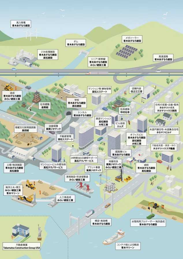建築工事と不動産有効活用の髙松建設と、大型土木・建築の青木あすなろ建設、海洋土木のみらい建設工業、法面工事・耐火工事の東興ジオテック、木造戸建住宅のタカマツハウスを中核とした、「髙松グループ」のホールディングカンパニーである株式会社髙松コンストラクショングループ。世界最古の企業とされる寺社建築の金剛組をはじめ、現在、特色ある企業19社の企業グループで構成しています。