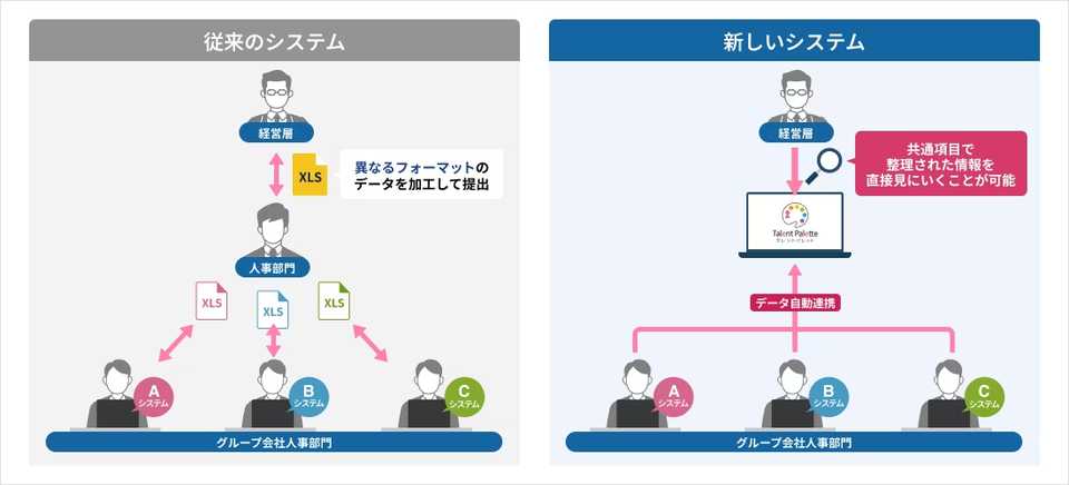 しかし、各社が異なる人事基幹システムを使用していたり、システムが未導入の場合もあったりして、人財情報を取得するには各社の人事部門を経由しなければならず、収集にかなり時間を要していました。また、個人情報が多く含まれるデータベースへのアクセスは人事部門内でも一部の担当者に限定されていたため、担当者にも大きな業務負荷がかかっていましたし、 様々な形式で提出されるデータを集計し経営層向けの資料をまとめるという作業にも、多くの工数がかかっていました。