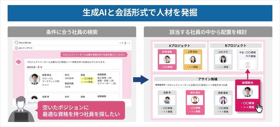 もう一つ期待するのは、定期異動の際の人員配置を支援してくれる機能です。定期異動では、ある人を異動させると、そのポジションに代わりの人財が必要となり、さらに別部署から人を移す、というように 異動が連鎖します。複雑な調整が必要となるため、 AIが各部署やポジションの要件に基づき最適な候補者を自動で提示してくれるようになれば、大幅な業務効率化が期待できると考えています。