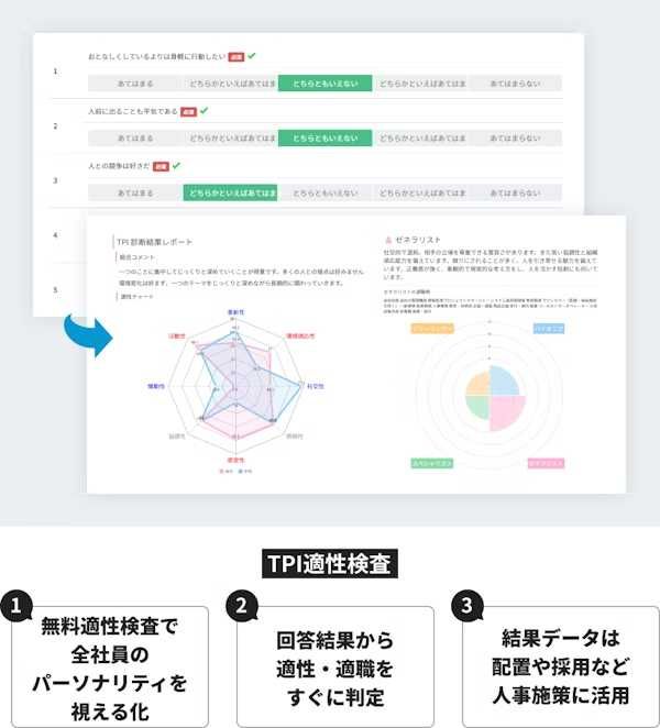 澤村様:リーズナブルな価格と、人事に活かせるTPI適性検査の機能です。比較検討した他社システムは、外部で受けた適性検査のデータを取り込むしか方法がなかったんです。タレントパレットならTPI適性検査が機能に含まれているため、連携がスムーズにでき良いと感じました。また、ただ情報が見られるようになっているのではなく、グラフで視覚的にも分かりやすい“視える化”がされていたのも印象的でした。