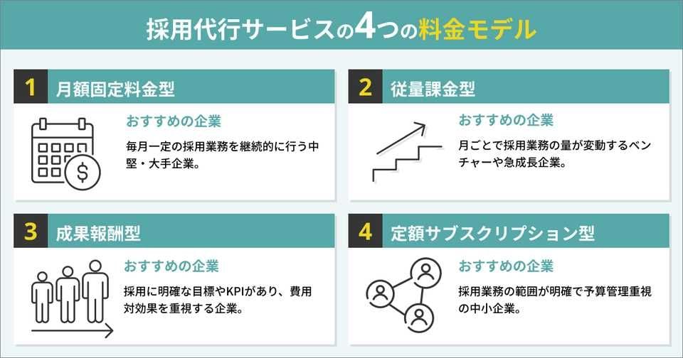 採用代行サービスには大きく分けて4つの料金モデルがあり、それぞれでおすすめの企業が異なります。