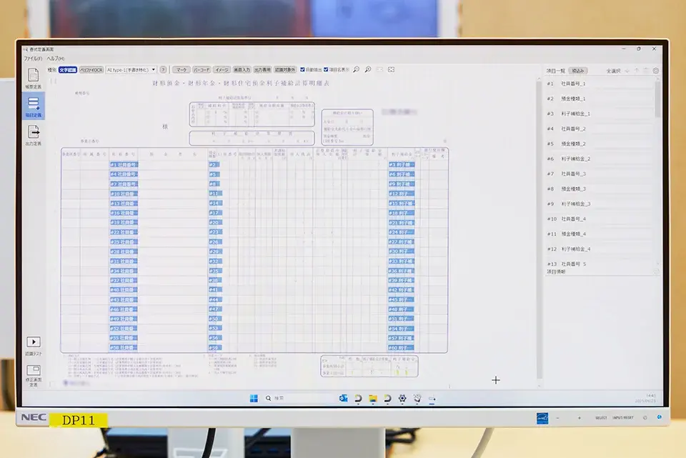 山崎さん 届いた紙の利子補給通知書は複合機でスキャンしてPDF化し、そのあと「DynaEye 11 Entry Lite AI-OCR」で読み取ります。利子補給通知書は、銀行ごとにレイアウトが固定の定型帳票で、読み取る場所の修正なども不要ですので、そのままCSVに出力します。その後のチェック方法は源泉徴収票と異なり、データと紙の利子補給通知書の情報を照らし合わせて行い、取り込み用のデータを作成しています。