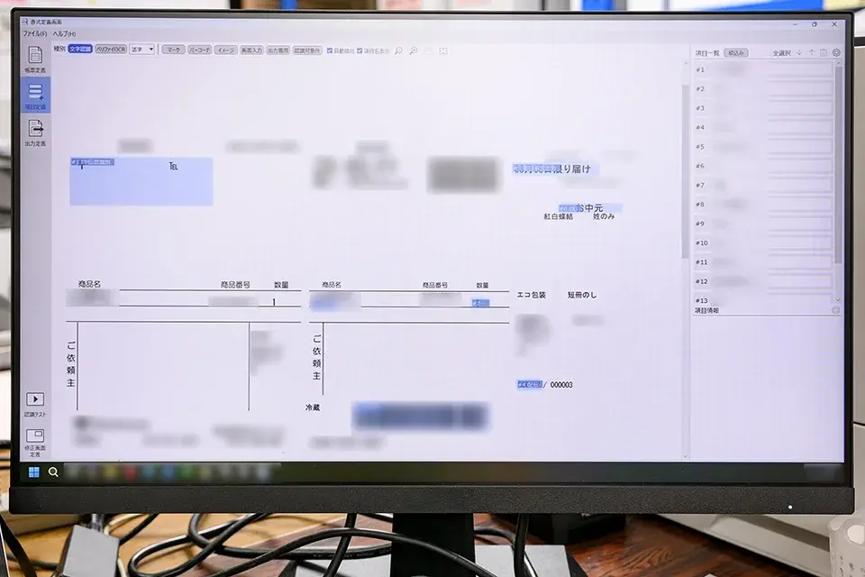 「DynaEye 11」で読み取る箇所は、伝票番号、品名、数量、出荷日(着日指定もあるため)、熨斗の有無など、個人情報以外の必要項目です。これらはすべて活字で、手書き文字はありません。また百貨店ごとに伝票のフォーマットが異なるため、「DynaEye 11」に複数の書式定義を登録しています。