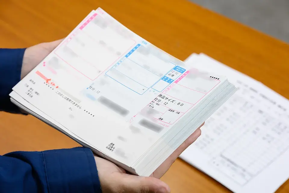 「小鑑」は百貨店ごとに、商品・出荷日・包装形態が同じ伝票のまとまりに対して1枚が指示書として添付されます。1枚のA4用紙に3連で「小鑑」を印刷したら、ミシン目で切り離し、対応する伝票と一括りにする「付け合わせ」の作業を行います。それを伝票班のスタッフが確認し、間違いがなければ包装の現場に渡します。