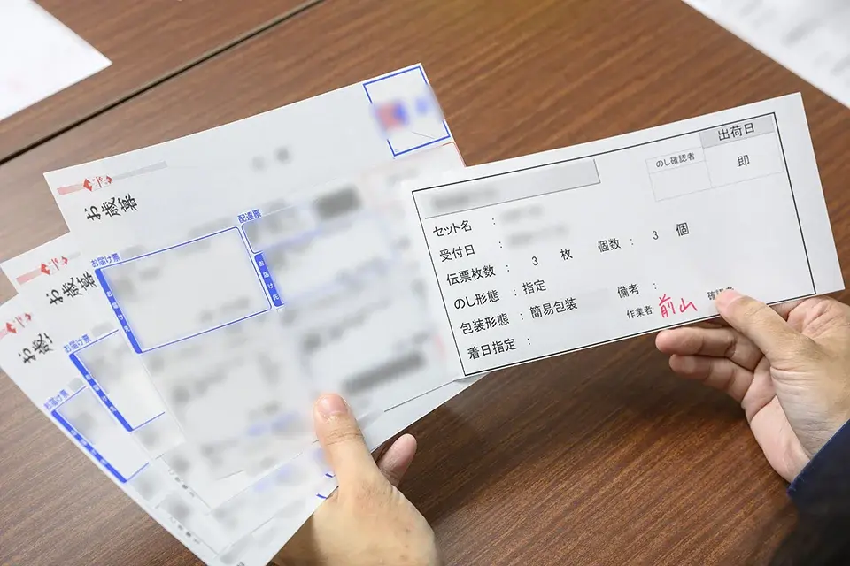 ここではN社ギフト発送代行業務における「発伝」から包装・出荷までの具体的なフローを、順を追って見ていきます。なお、取材はお歳暮シーズン直前の2024年11月中旬に行いました。