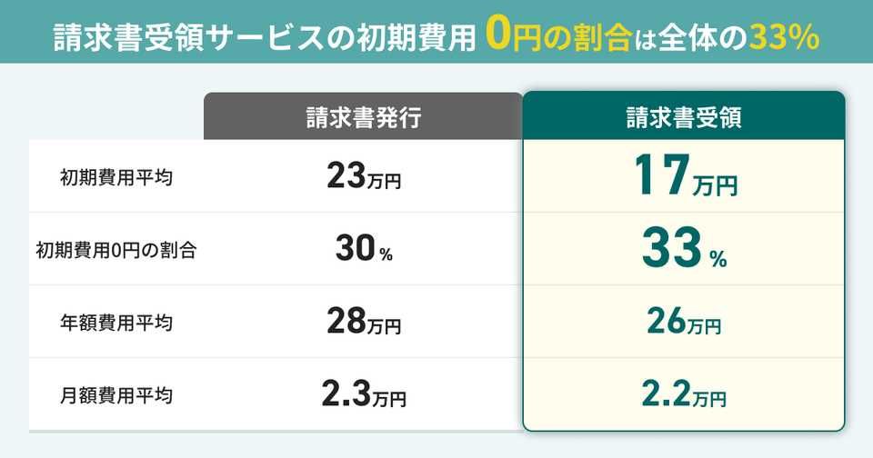 初期費用の平均額は請求書発行システムが23万円であるのに対し、受領サービスは17万円とより低コストです。さらに、初期費用0円で利用できるサービスの割合は受領サービスが33%と、発行システム(30%)をやや上回る結果となっています。
