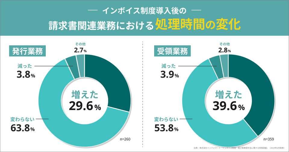 下図の調査結果が示すように、インボイス制度導入後に「請求書の処理時間が増えた」と回答した企業の割合は、発行側が29.6%であるのに対し、受領側は39.6%と約10%も高く、受領業務の方が負担増加を強く感じていることが明らかになっています。