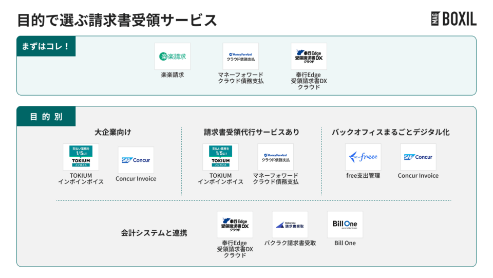 そこで「SaaS比較サイト BOXIL(ボクシル)」が、請求書の処理業務がラクになる請求書受領サービス14選を厳選しました。さらに、各サービスの料金・機能をまとめた『比較表』もご用意していますので、ぜひ自社にマッチするサービス選びにお役立てください。