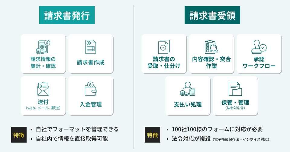 請求書処理というと、多くの方は「請求書を作成して送る作業」を思い浮かべるのではないでしょうか。しかし実際には、請求書処理は「発行側の業務」と「受領側の業務」という2つの大きな流れに分かれています。