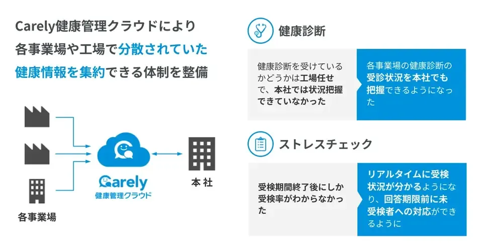 健康課題の把握が難しい中、Carely健康管理クラウドの導入により健康情報を一元管理し、可視化を実現。