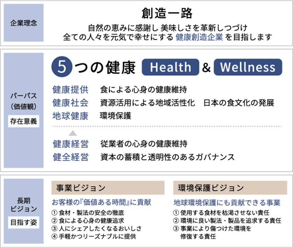 もともと「健康創造企業」という理念があったため、社内への浸透はスムーズでした。現在は、パーパスとして「5つの健康」を制定し、従業員に向けた当社の存在意義を表す言葉として「健康経営」を掲げています。
