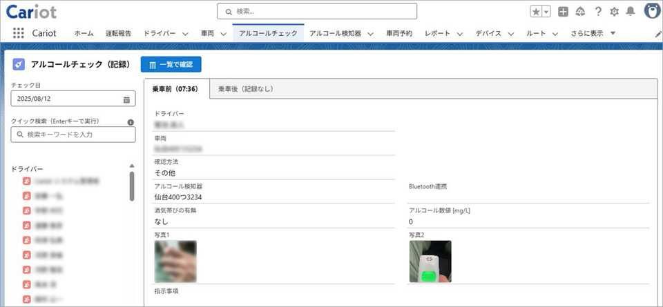 アルコールチェックは弊社支給の検知器を利用して行い、Cariotモバイルアプリを起動して写真を撮影しています。これにより、既存の検知器を活用しながら、Cariotと連動してデータを自動保存できています。 チェック未実施のドライバーも即時に管理者側で確認できるので、紙の運用に比べて正確性もスピードとともに向上しました。