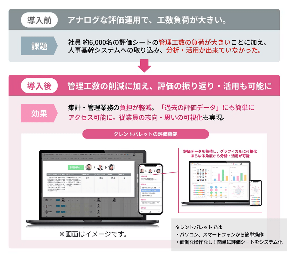 全国の施設で勤務する約6,000名の社員が対象となっており、これまではExcelや印刷したA3の紙で評価を行っていました。