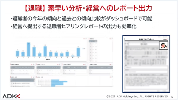 その他には退職者の傾向も、自動的にダッシュボード化できる仕組みを整え、今年の傾向や、過去との傾向比較がダッシュボードの中で見られるようにしました。例えば月別の退職者の数や職種やグレード別など様々な視点で分析し、対応を検討しています。