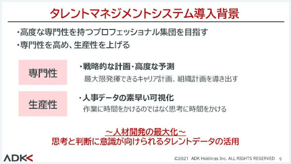 またADK全社が目指すのは、「高度な専門性を持つプロフェッショナル集団」です。専門性を先鋭化するためには、今どんな人材が社内に存在しているのか、社員にどんなスキルを身に付けさせるべきなのか、どんな適性の人材が活躍しやすいのかといった面を知る必要があり、そのために人事データの活用に着目しました。