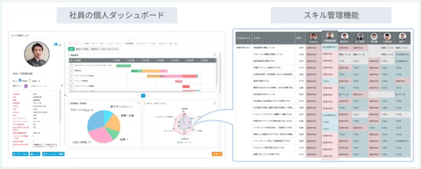 スキル管理機能:スキル管理機能では、業務や職種・役職別などで登録したスキルセットをもとに、本人もしくは上司が評価したスキル状態を見える化することができます。 定期的にスキル状態を登録することで、スキルアップの時系列変化を可視化することも可能です。