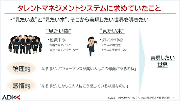 私達がタレントマネジメントシステムに求めていたことは、「見たい森(組織全体)」の状況を俯瞰(ふかん)してみながら、「見たい木(個々の社員)」が持つパフォーマンスを見ることでした。