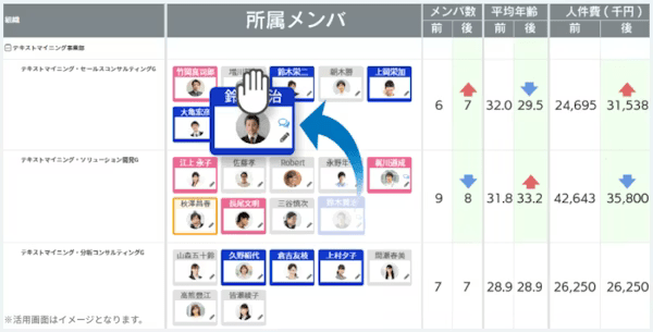 異動シミュレーション:社員の顔と名前、人事異動の意思決定に必要になるキャリア(経験)やスキル、組織への滞留期間を一覧で見ながら、人材配置のシミュレーションをすることが可能です。社員のアイコンをドラッグ&ドロップで異動させる直感的な操作で、異動によるキャリアやスキルの偏りといった影響度をしることができ最適な人事異動を実現できます。