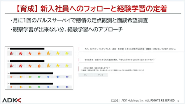 タレントパレットは様々なシーンで活用していますが、まずは新入社員へのフォローの事例をご紹介します。最近はコロナ禍ゆえに、新入社員にいきなりテレワークを要求するなど業務環境の変化も大きいので、弊社では社員へのサポート体制を整える必要を感じ、月に1回パルスサーベイを実施しています。