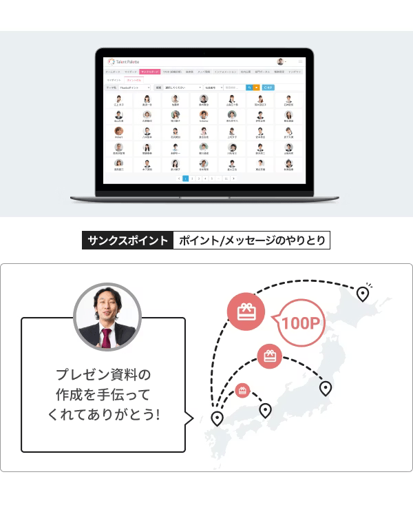 田中様:主に、社員の基本情報の検索、研修管理、人事評価、アンケートを活用しています。また、7月から社員間で感謝をポイントとして付与できる「サンクスポイント」の展開を始めました。これまでも組織内のコミュニケーションは比較的よく取れていましたが、店舗や組織を跨いだコミュニケーションの場が少ないことが課題でした。サンクスポイントは導入初日から積極的に活用しているメンバーが多く、新しいコミュニケーションの一つとして社内に浸透してきていると感じています。
