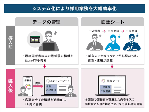採用についても、今までは選考の終盤まで進んだ学生のぶんだけ履歴書から最低限の情報をExcelに手打ちで記録していました。今は採用サイトのデータをタレントパレットに連携することで簡単に集約できています。