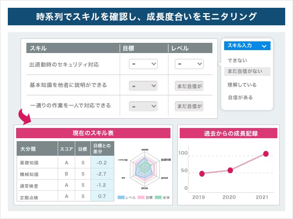 これによって叶うのは「時系列で見ること」。個人がどれだけの力量をもっているのか、ここ1〜 2年でどれだけ成長したのかが一目でわかるので、経営層が指導しやすい仕組みづくりが期待できます。