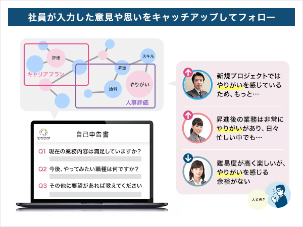 導入前は「人事に相談したいか」というチェックボックスを設けて、チェックがついている重要なものについては人事が内容を確認していたのですが、そうでないものについては見落としてしまっていることもありました。タレントパレットに移行したことによって、見落としがなくなり、「最近どう?」という声かけなどタイムリーなアクションに繋げられるようになっています。
