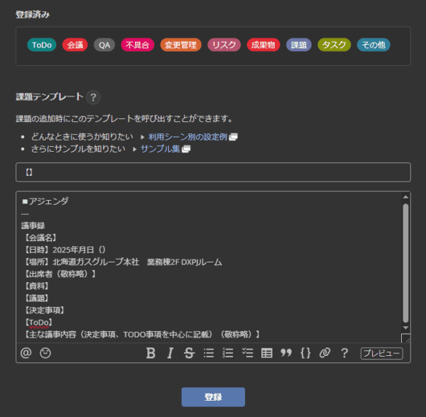 「会議カード」として利用する課題のテンプレートを登録。課題のタイトルは頭にスミカッコで【案件名】を必ず入力するルールを徹底することで、課題一覧画面のタイトルでソートをかけると、同案件の課題がまとまって表示されるようになる