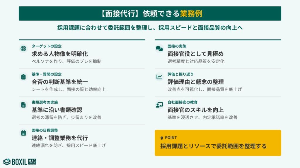 面接代行サービスは、面接の実施だけでなく、面接の前後に発生する設計や運用の業務まで委託できる場合があります。採用課題と社内リソースに合わせて委託範囲を整理すると、採用スピードと面接品質の両方を高めやすくなります。