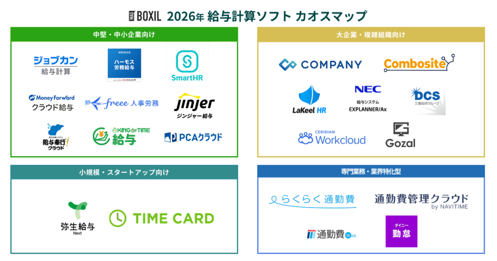 2026年、企業のDX推進やデジタル給与払いの解禁に伴い、給与計算ソフトの重要性はますます高まっています。BOXILでは、給与計算ソフトの選び方や立ち位置がひと目でわかるカオスマップを作成しました。小規模・スタートアップ向けから大企業向け、専門業務特化型まで幅広く掲載しています。