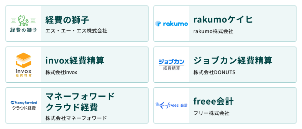| 経費の獅子 | rakumoケイヒ | invox経費精算 | ジョブカン経費精算 | マネーフォワード クラウド経費 | freee会計 | |