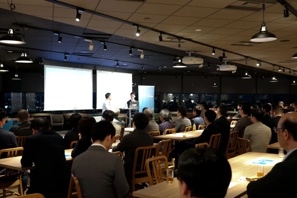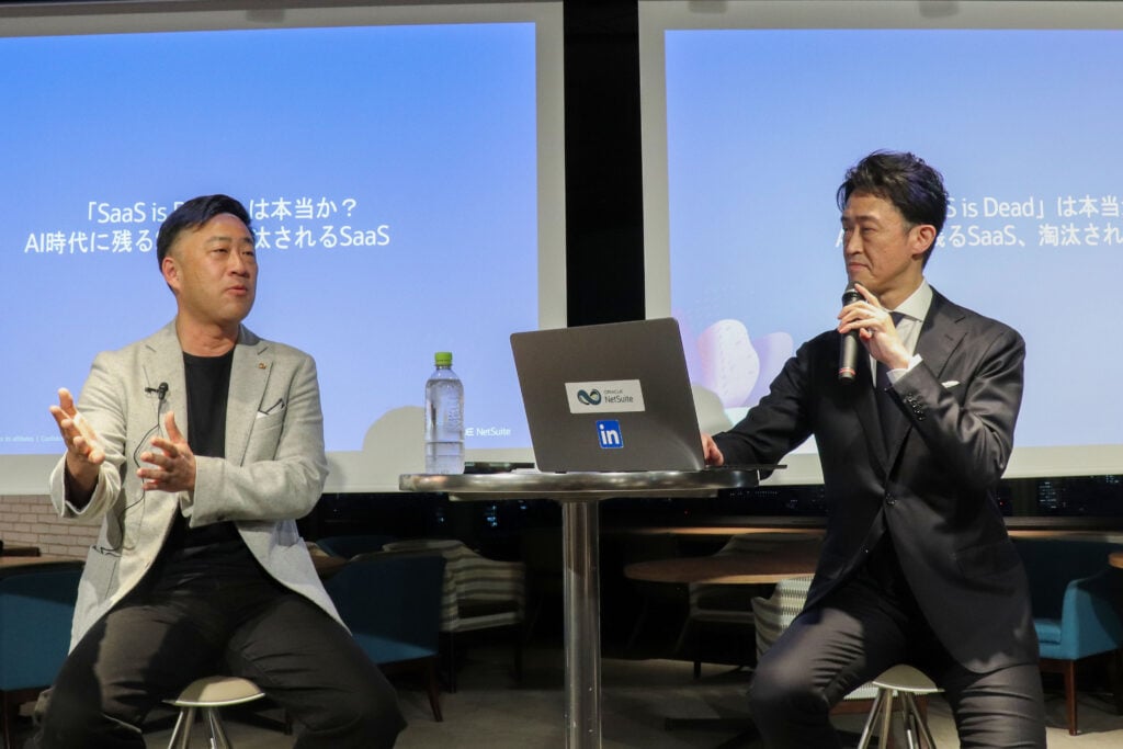 懇親会では株式会社チームスピリット 代表取締役CEO 道下 和良氏をゲストに迎え、NetSuite事業統括 営業統括本部 営業統括部長の福宮氏がモデレーターを務める対談が行われました。