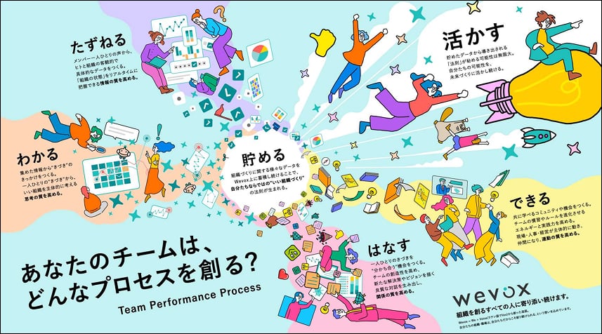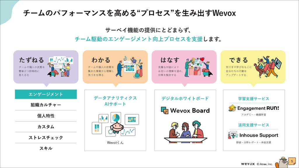 そのほか、エンゲージメントをどう高めていくかについて、これは学校で習うものではないですし、体系的に学べるツールがあったとしても自分たちの結果と連動させて学べる場がないので、Wevox上で学習できる機能や学び合えるコミュニティを運営しており、それらをWevox内に内包して「チームサクセスプラットフォーム」と呼んでいます。