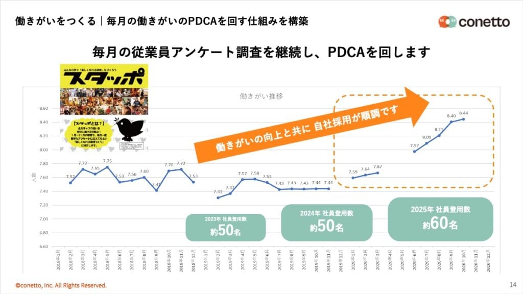 サーベイのスコアとともに、リファラルやアルバイトから社員登用される人数も増加し、2025年には約60名に到達。conettoを「使い倒す」取り組みが働きやすい職場づくりに生かされているのかもしれません。