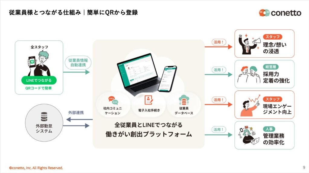 御宿「conettoは従業員データベースとLINEをつなぐツールです。本社や店舗からの連絡、申請手続きなど、従業員との間で発生するコミュニケーションをLINEで完結できます。