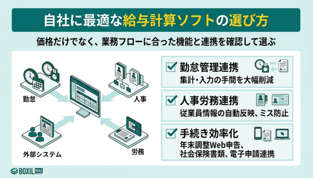 - ソフト選定では月額費用だけでなく、勤怠管理・人事労務システムとの連携可否と、年末調整・社会保険手続きまで対応できるかを確認する