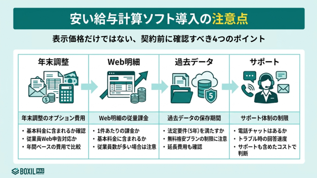 月額費用が安い製品を選ぶ際は、表示価格だけで判断しないことが重要です。年末調整やWeb明細発行が別料金になっていたり、サポートが制限されていたりするケースがあります。契約前に次の4点を必ず確認してください。