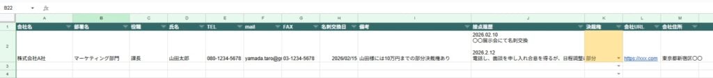 ※画像の名刺管理シートでは、接点履歴をどのように書けばいいのか見やすくするために、行の高さを指定していません。