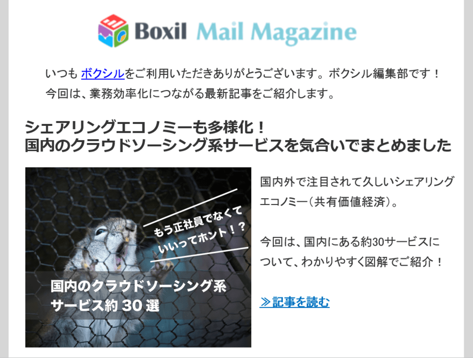 こちらは、 ボクシル 会員向けに配信しているHTMLメールの例であり、弊社メディアである ボクシルマガジン のコンテンツを、メルマガとして定期的に配信しているものになります。
